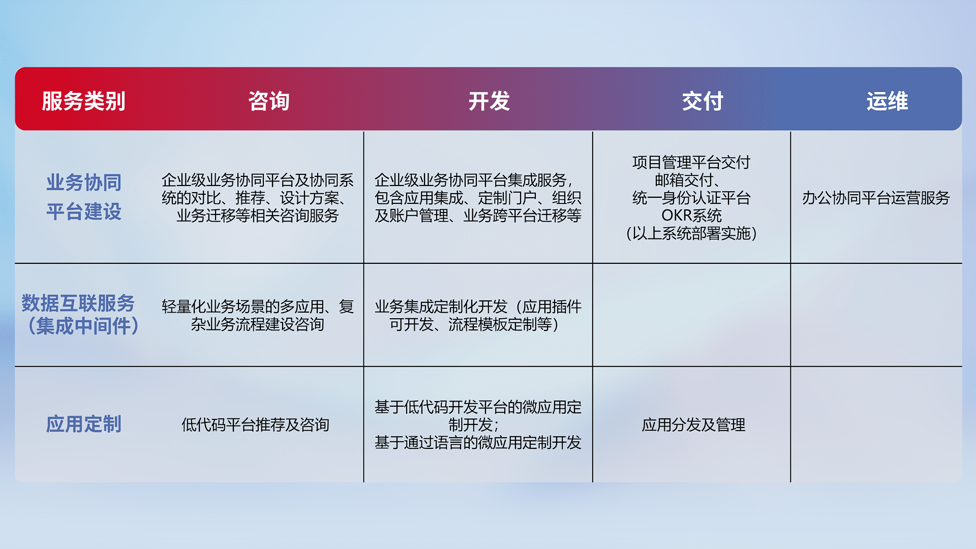 针对钉钉、、、企微、、IDaas等平台级产品提供产品的规划、、、方案、、、交付、、、、定制化开发等服务,,实现如统一协同办公、、、、智能客户服务、、、混合会议管理、、、、智能数据查询、、等业务场景,,,,实现数字化转型。。。